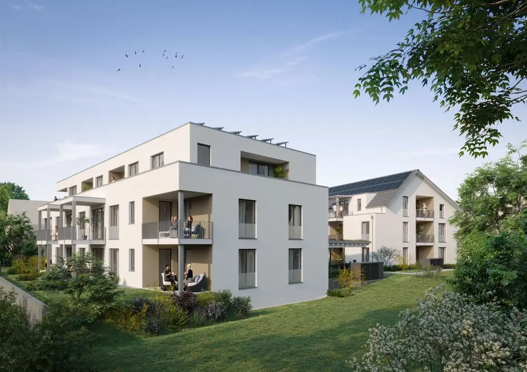 Neubauprojekt in Kehl: 2 Wohnhäuser mit 30 modernen 2-Zimmer-Wohnungen, Balkon/Terrasse, Einbauküche, Aufzug und Tiefgarage. KfW-40 mit QNG-Siegel. Attraktive AfA-Vorteile für Kapitalanleger und sehr gute Vermietbarkeit nahe Straßburg.